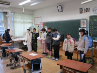 6年生を送る会の準備でしょうか、3・4年生はランドセルと背負って何かをしているようです。