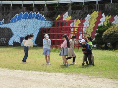 全校ゲームでは「かもつ列車」をしました。保護者の方も参加していただき、長い長い「かもつ列車」ができました。